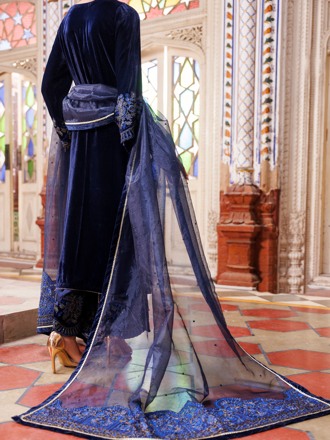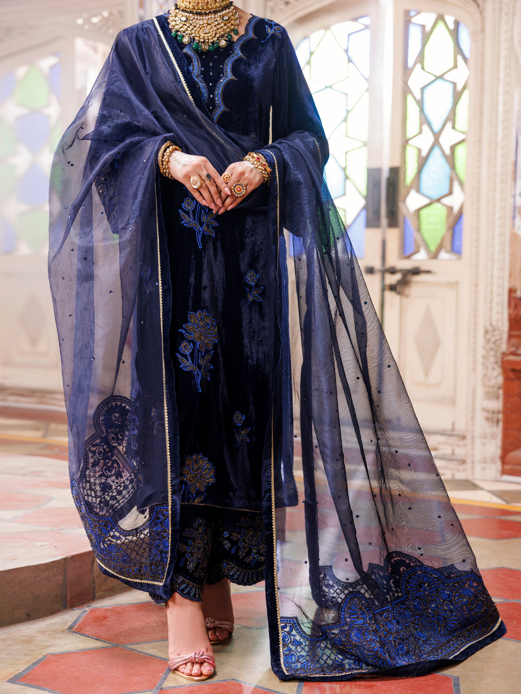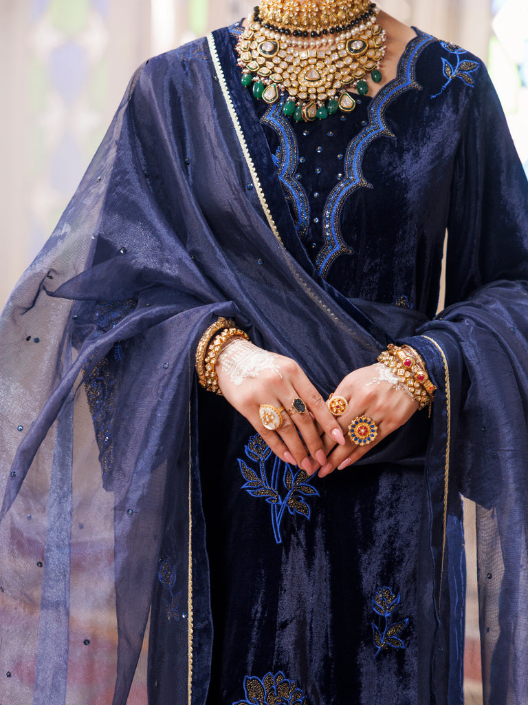 Velvet 3Pc Stitched Full Embroidered Shirt With Hand Touch-Up Detail Paired With Raw Silk Embroidered Qulots And Styled With Organza Embroidered Dupatta.