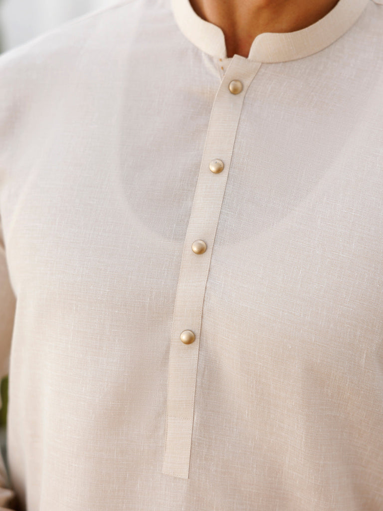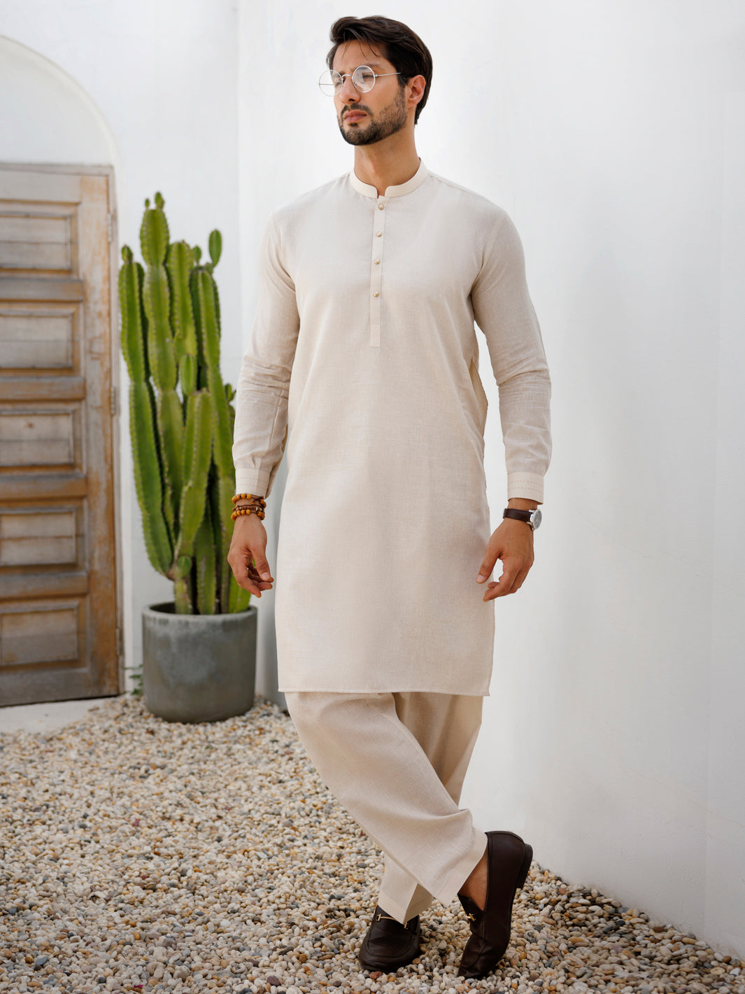 Beige Kameez Shalwar Featuring Finely Tailored Cut & Sew Detailed With Minimal Stitches on the Cuffs