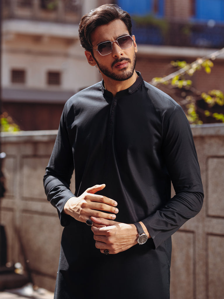Semi formal kurta adorned with intricate embroidery on the placket and collar