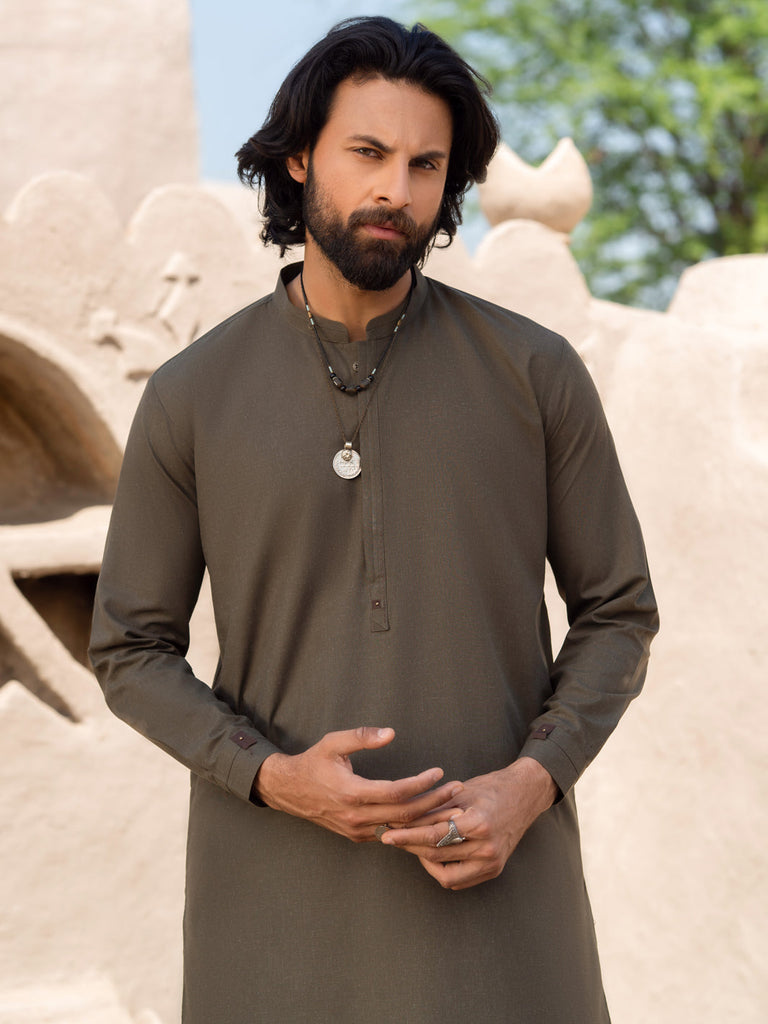 Kameez shalwar featuring minimal stitch details on the placket with premium quality buttons