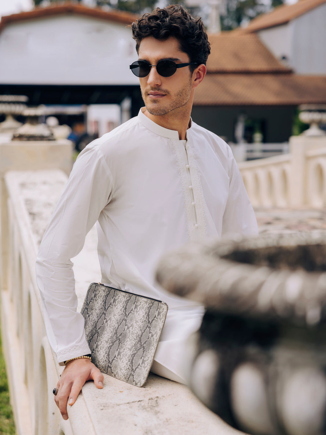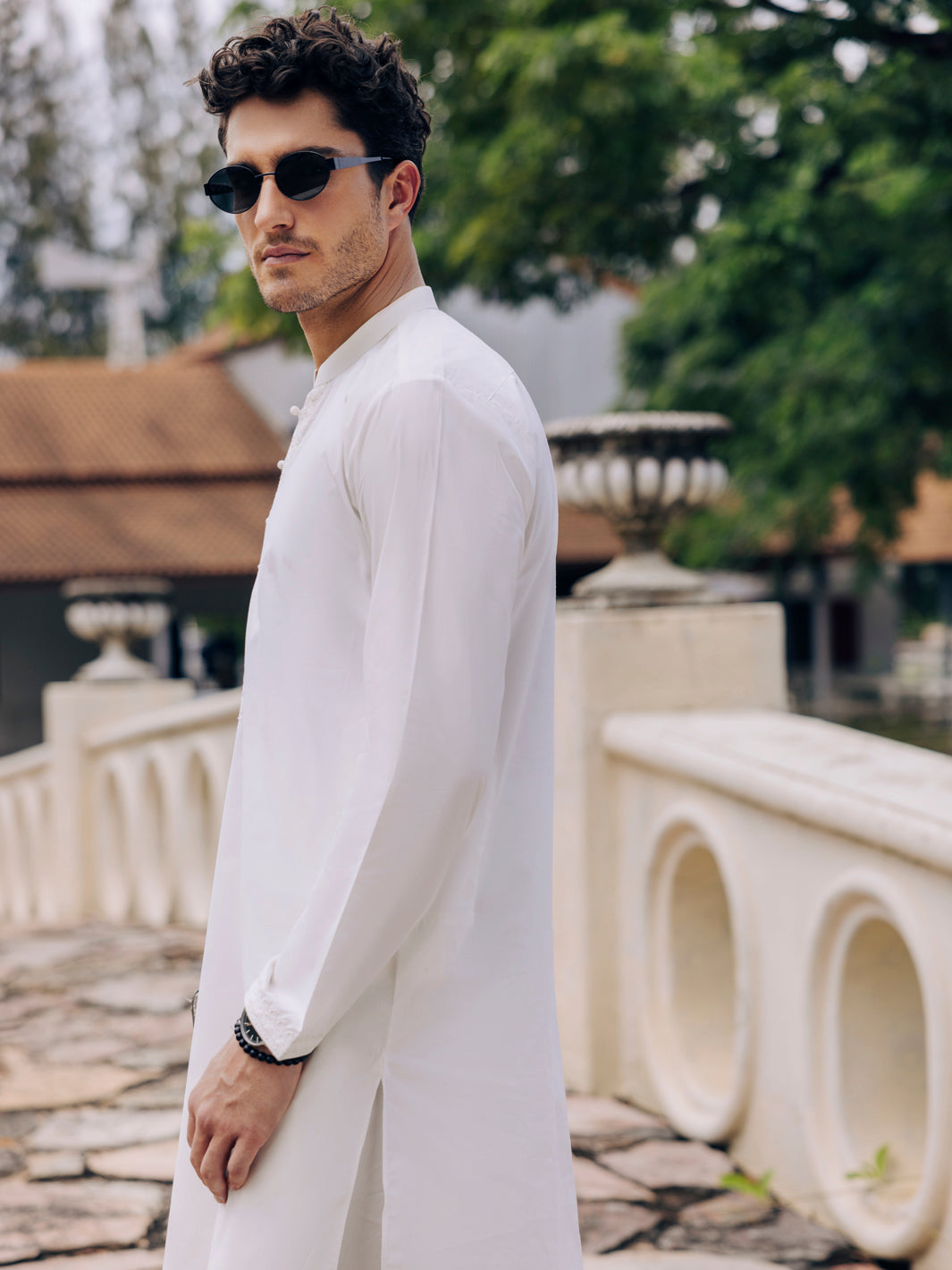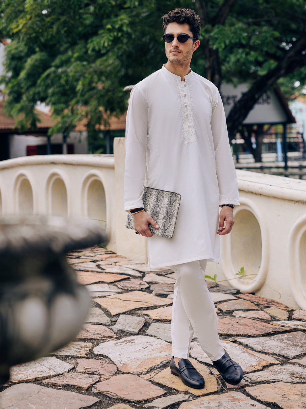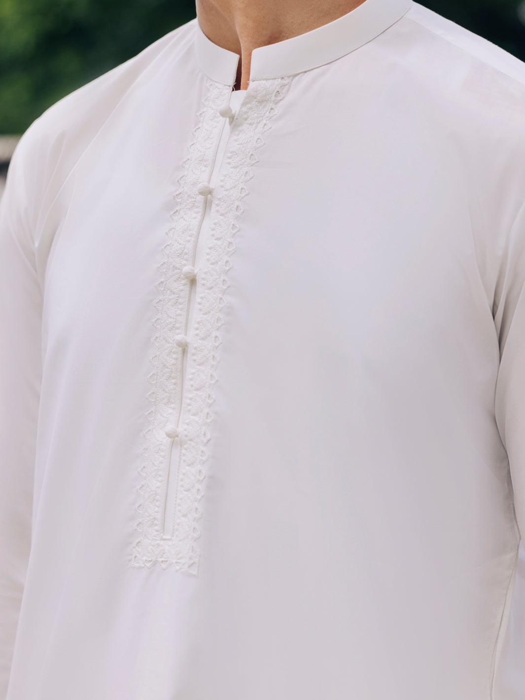 Semi Formal Kurta Trouser With Embroidery Details Around the Placket and Sleeves Adorned With Loop Buttons