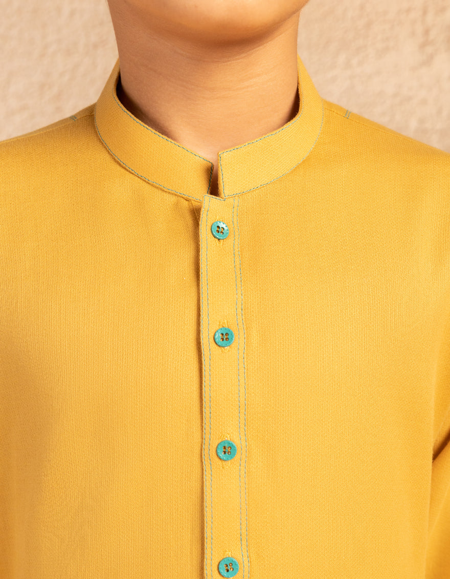 Introducing our kid boys' mustard cotton casual kurta, crafted with comfort in mind for your little ones. Let them explore and play in style with our comfortable and stylish outfit.