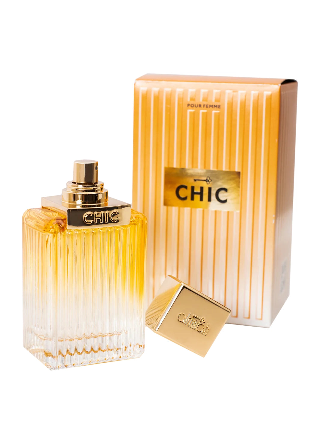 CHIC is subtly alluring, crafted for the woman who radiates vibrant energy and bold style. Sparkling mandarin and juicy mango provide a playful, fruity introduction that blossoms into a refined floral heart of cyclamen, freesia, rose, and jasmine. With a creamy, rich base of vanilla, sandalwood, musk, and amber, CHIC leaves a velvety, lasting impression that feels personal and magnetic, perfect for the woman who's all about living out loud, full of charm and cheer.