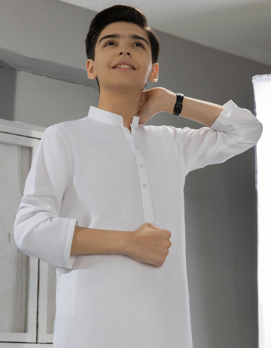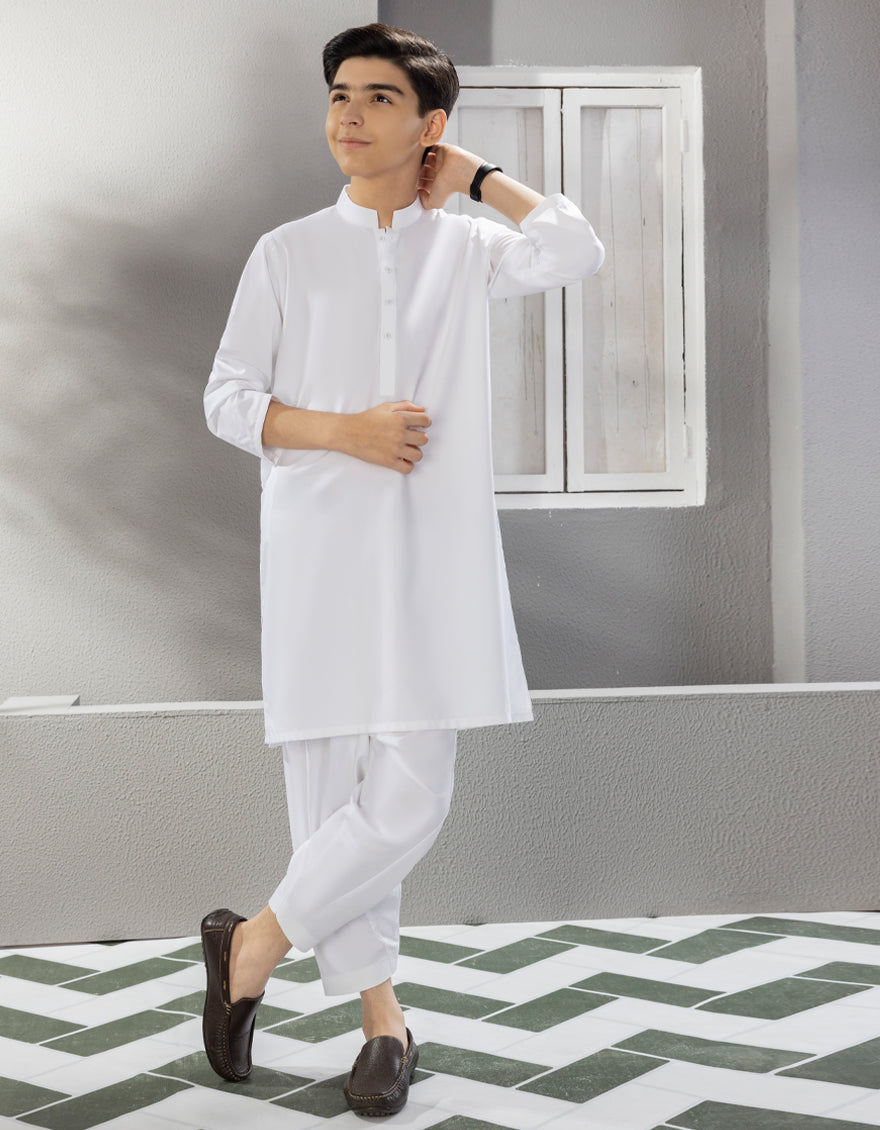 Made for the modern young man, this White Blended Kameez Shalwar is a perfect blend of style and comfort. Its simple yet elegant design makes it suitable for a range of occasions, ensuring that your little one looks his best.