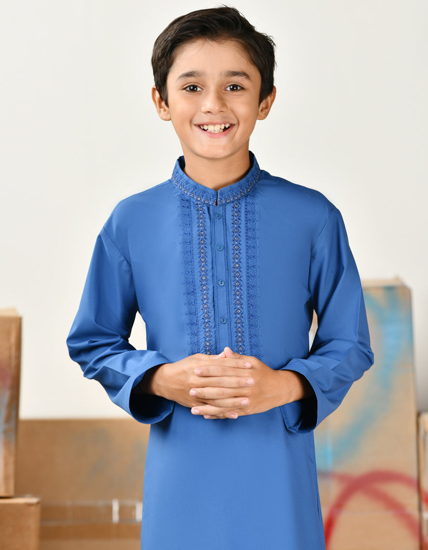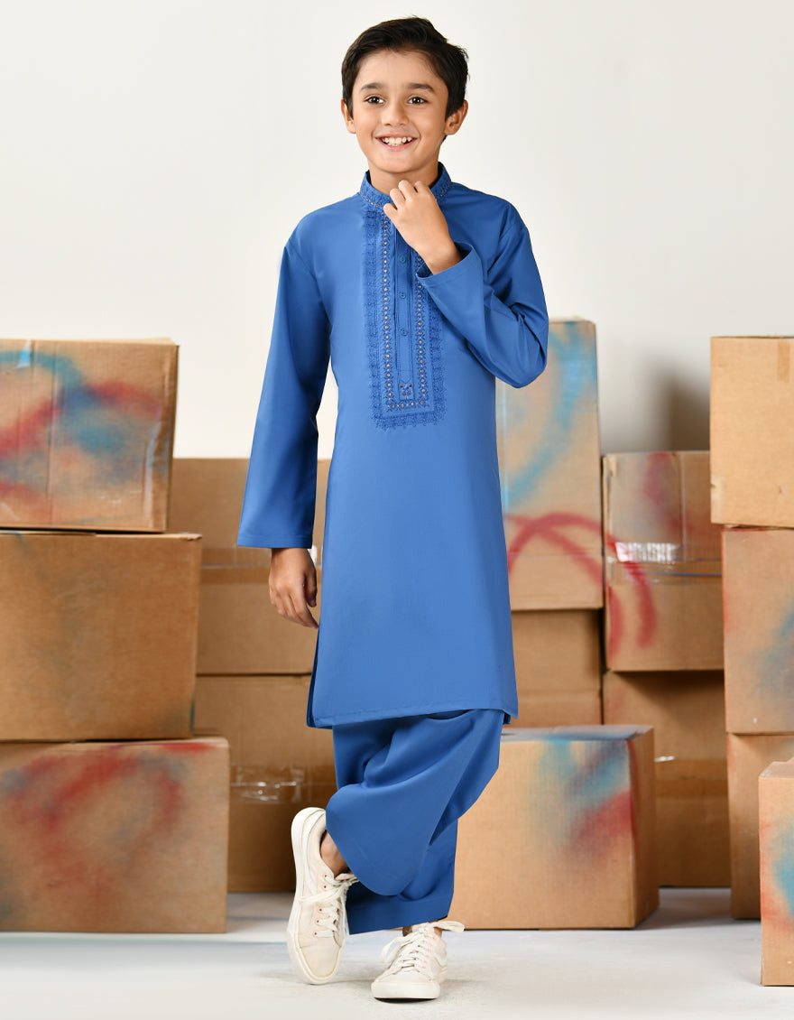 Made for the modern young man, this kameez shalwar is a perfect blend of style and comfort. Its simple yet elegant design makes it suitable for a range of occasions, ensuring that your little one looks his best.