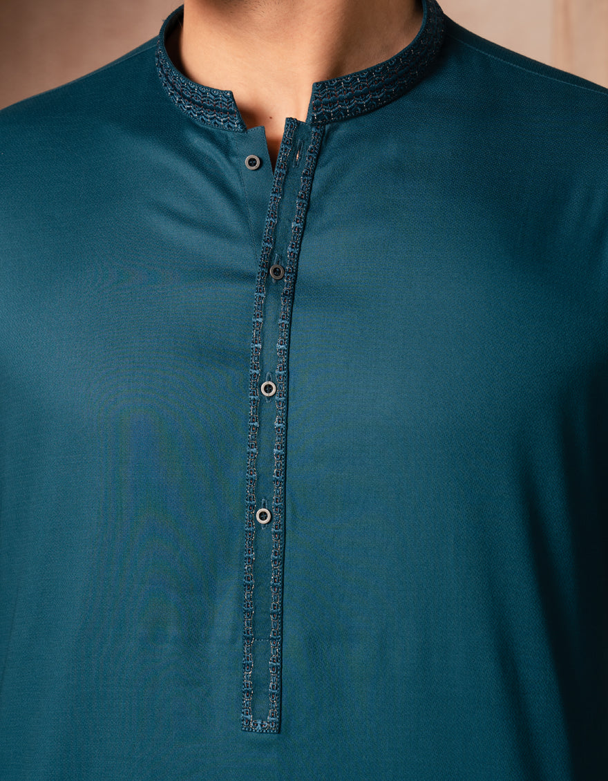 This teal cotton semi-formal kurta offers a neat, stylish look that works well for family gatherings, dinners, or casual events. Easy to wear and effortlessly smart.