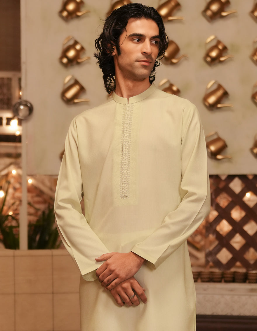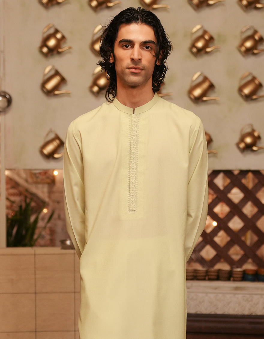 Upgrade your look with this Light Green Blended Semi-Formal Kurta, which mixes traditional and modern styles for a classy yet comfortable outfit.