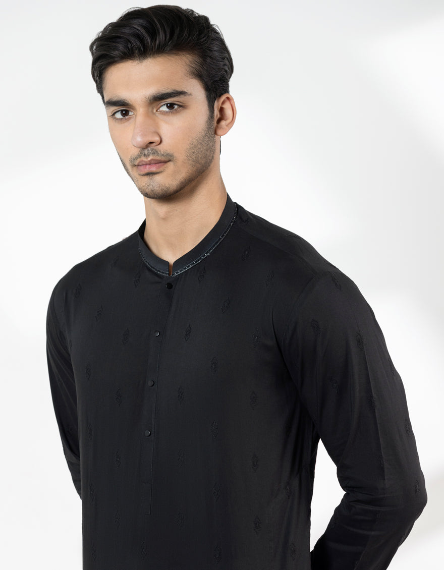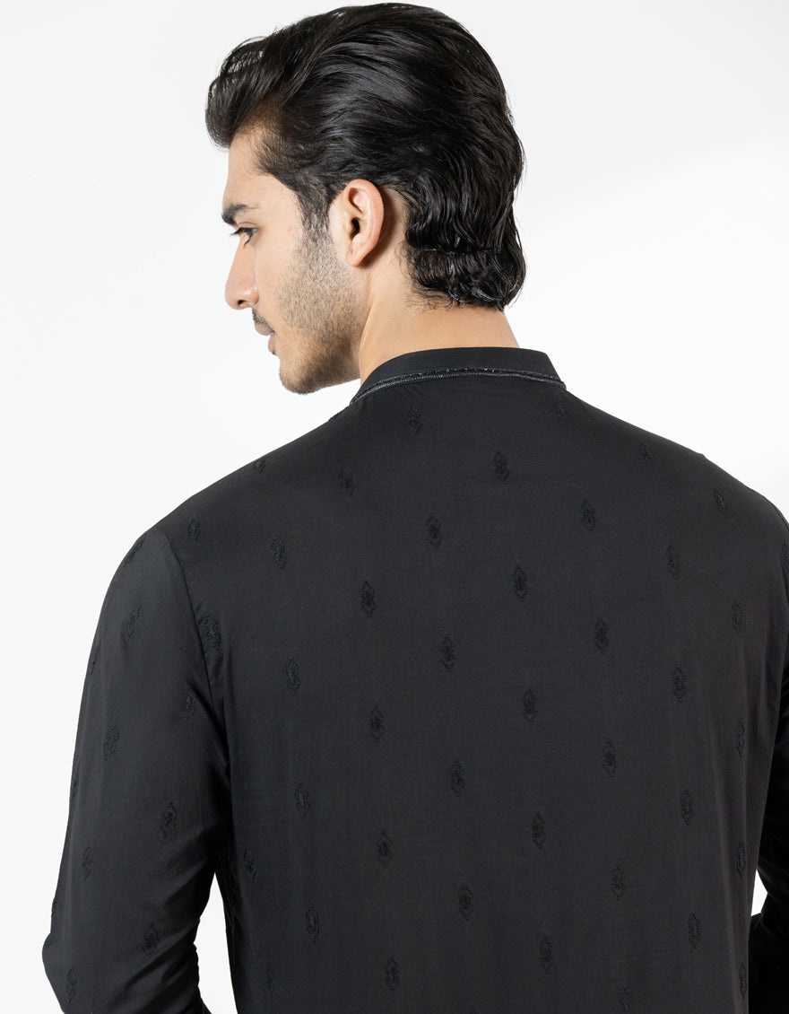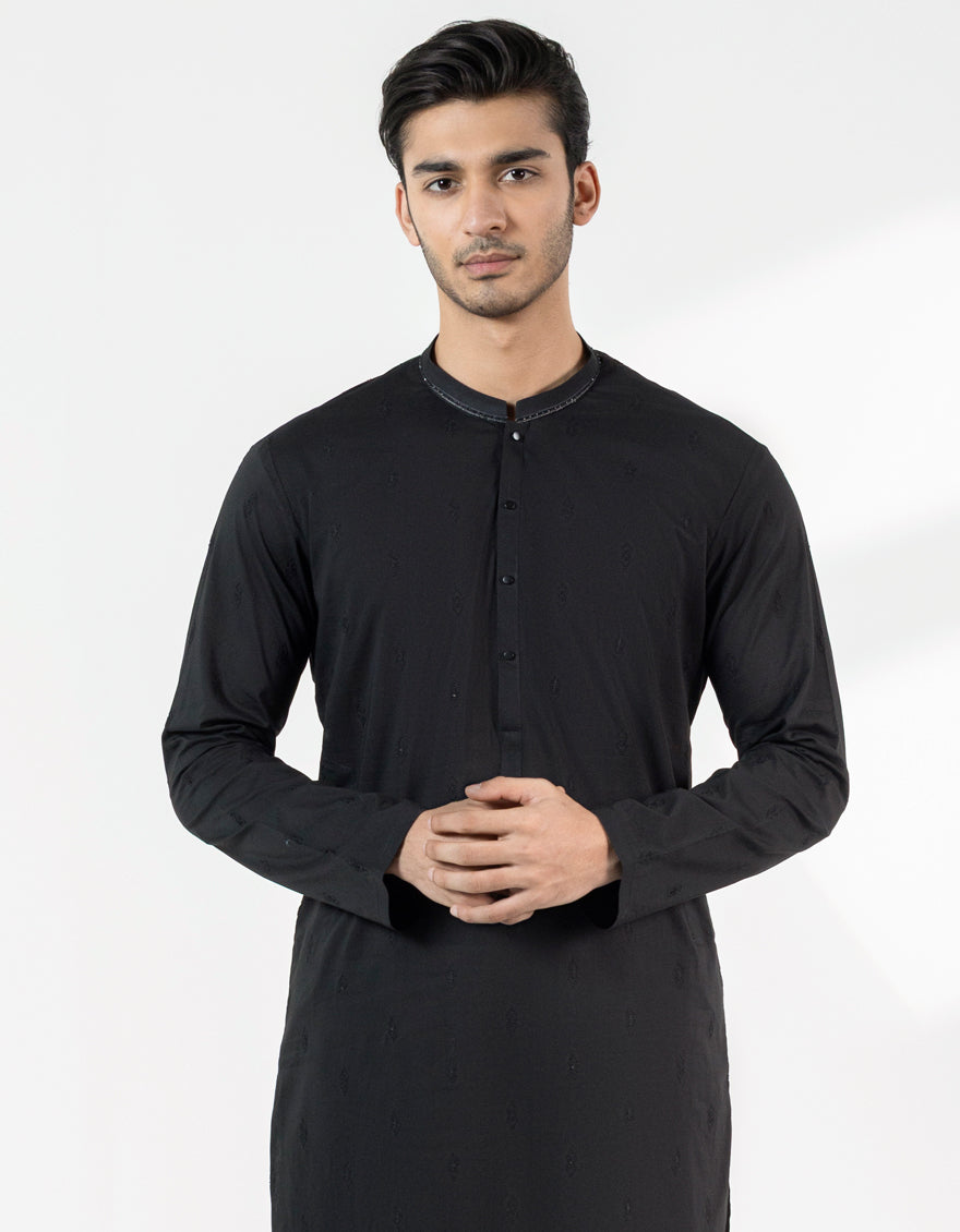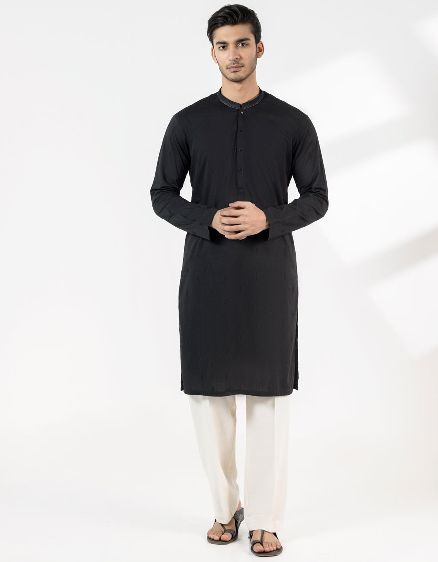 This Black Cotton Schiffli Formal Kurta combines elegance with simplicity. Finished with detailed stitching and smart button styling, it's ideal for semi-formal occasions or casual meetups. A versatile piece that carries both ease and refinement.
