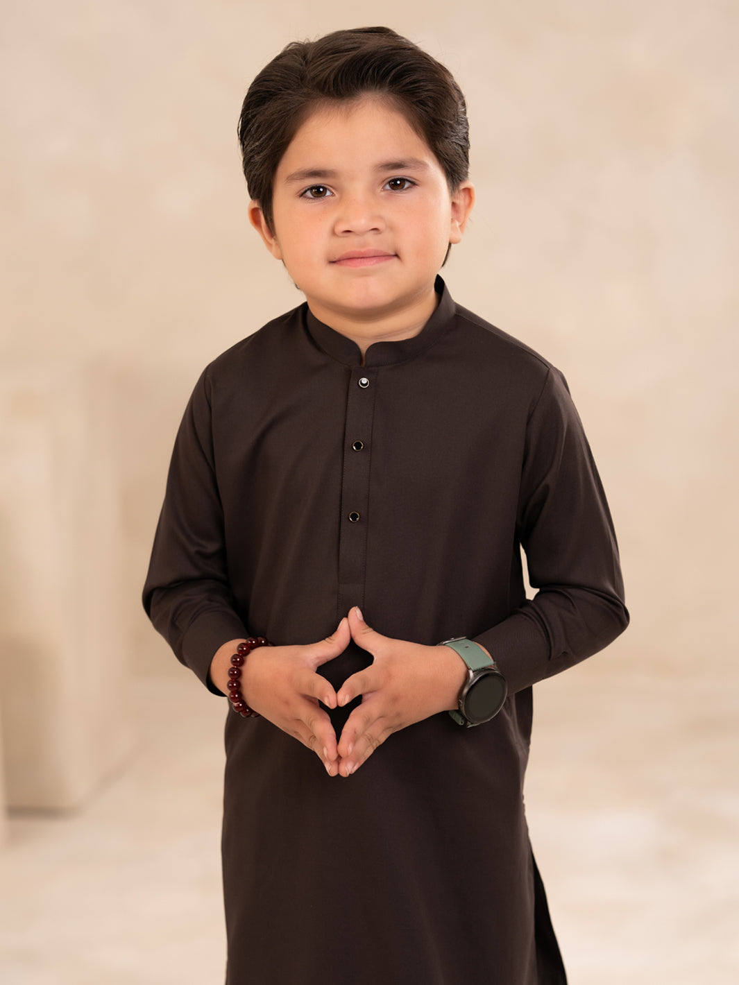 Dark Brown Kurta Shalwar With Embroidery Details And Wooden Loop Buttons For Boys