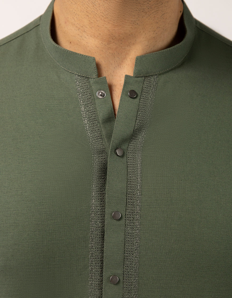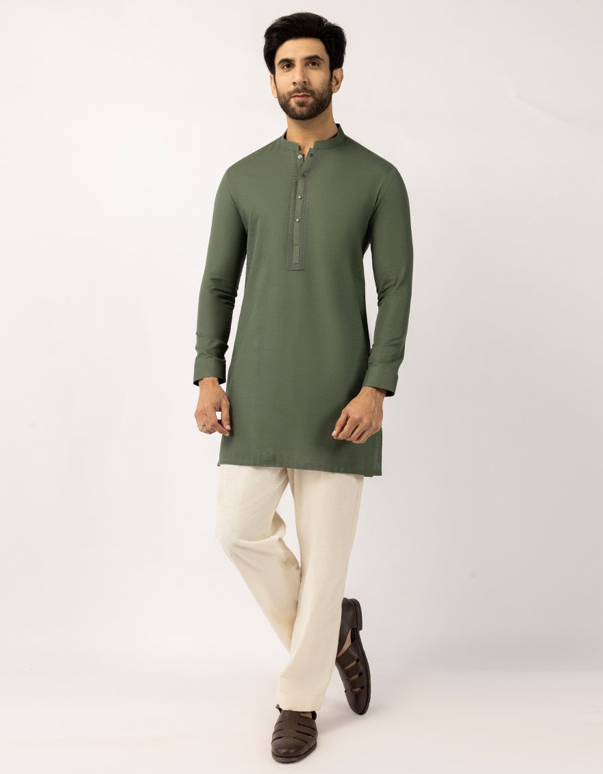 This Green Cotton Semi-Formal Short Kurta combines classic style with modern simplicity. Featuring a comfortable thigh-length cut, it€™s designed for easy, everyday wear. The color tone adds versatility, making it a perfect choice for a polished yet laid-back look.