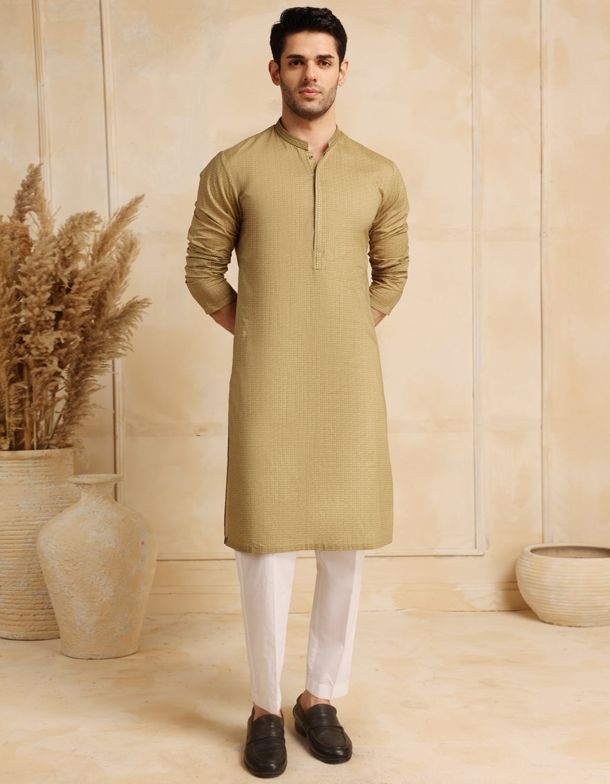 This Olive Cotton Semi-Formal Kurta has a simple yet elegant look, combining tradition with a modern touch.