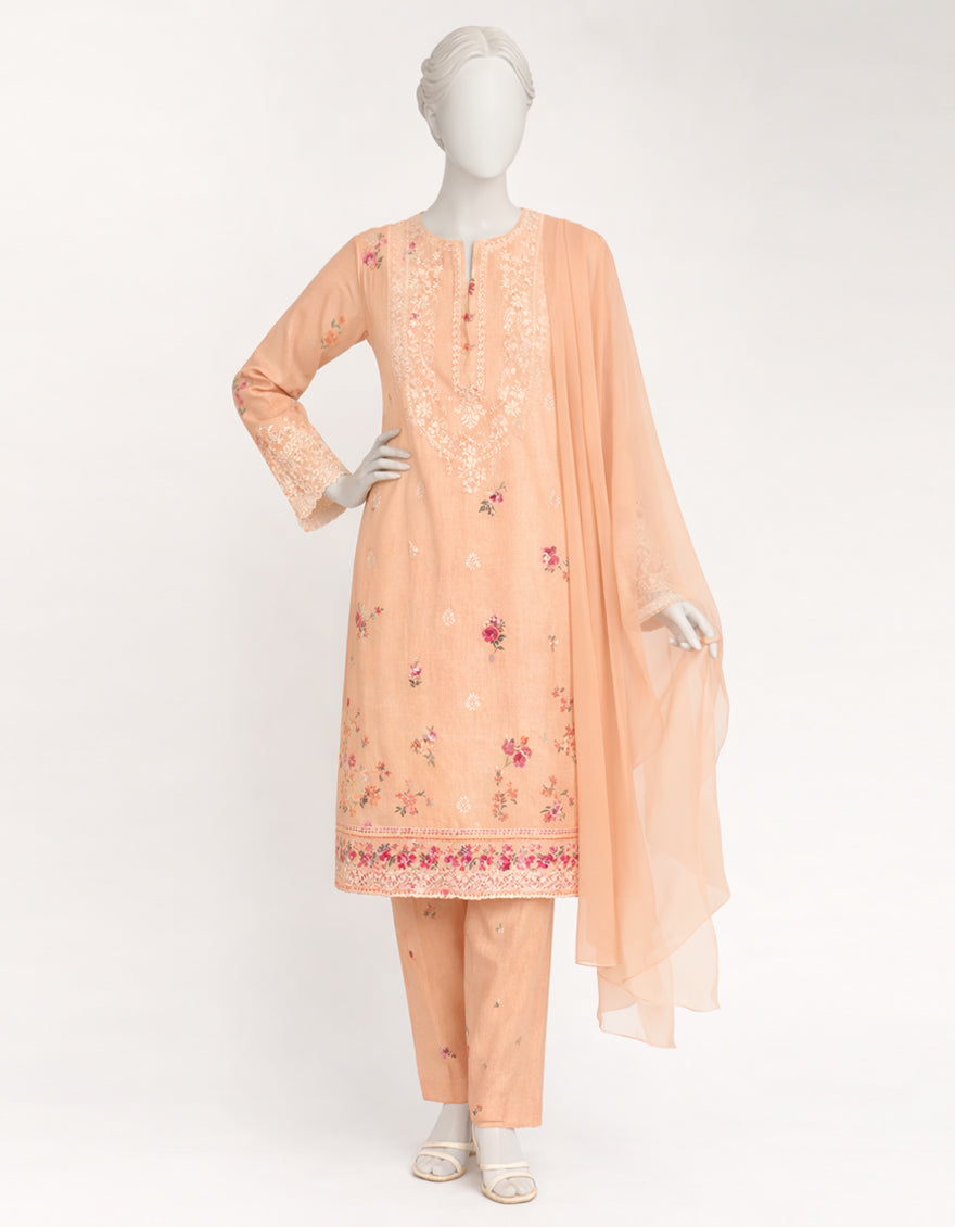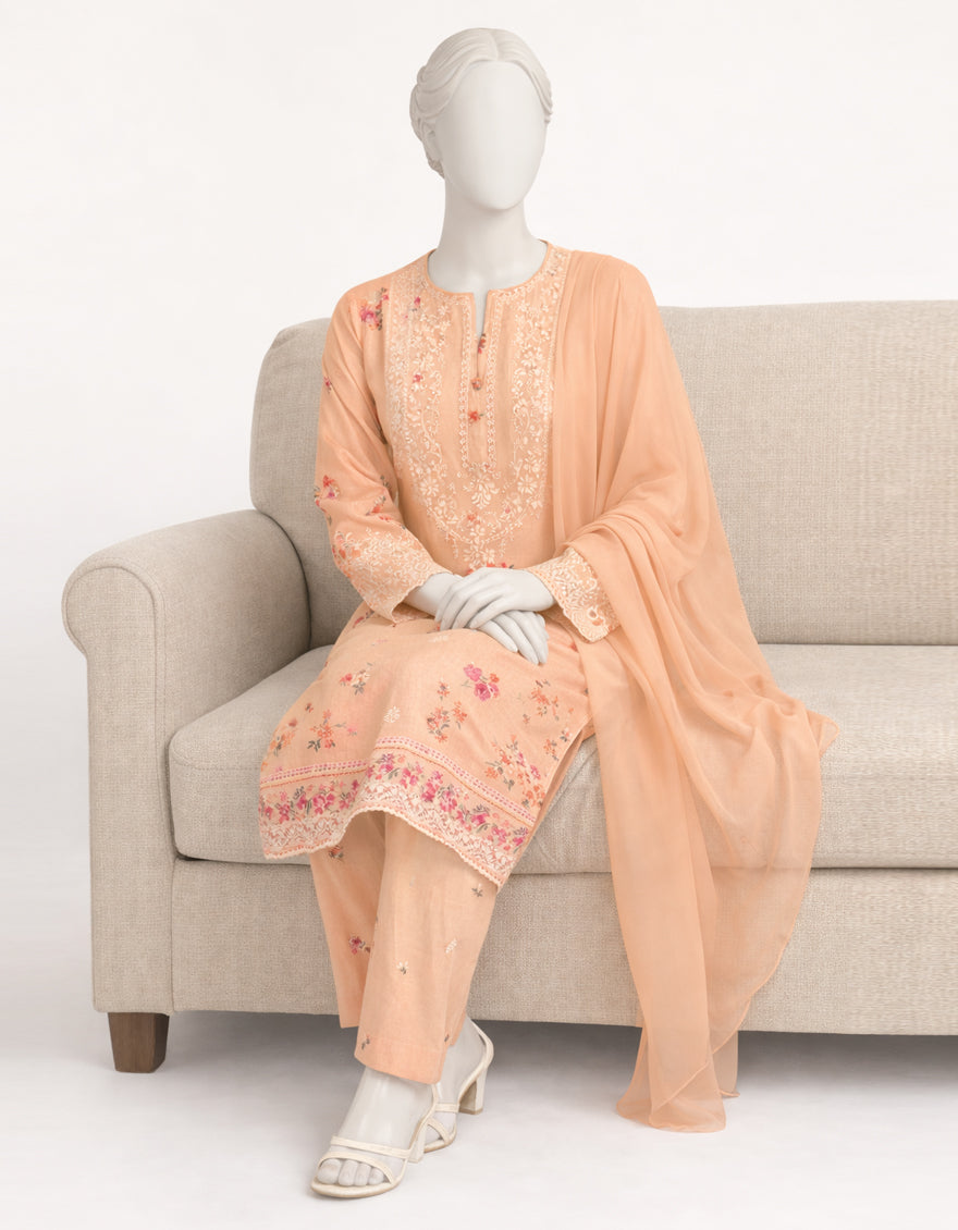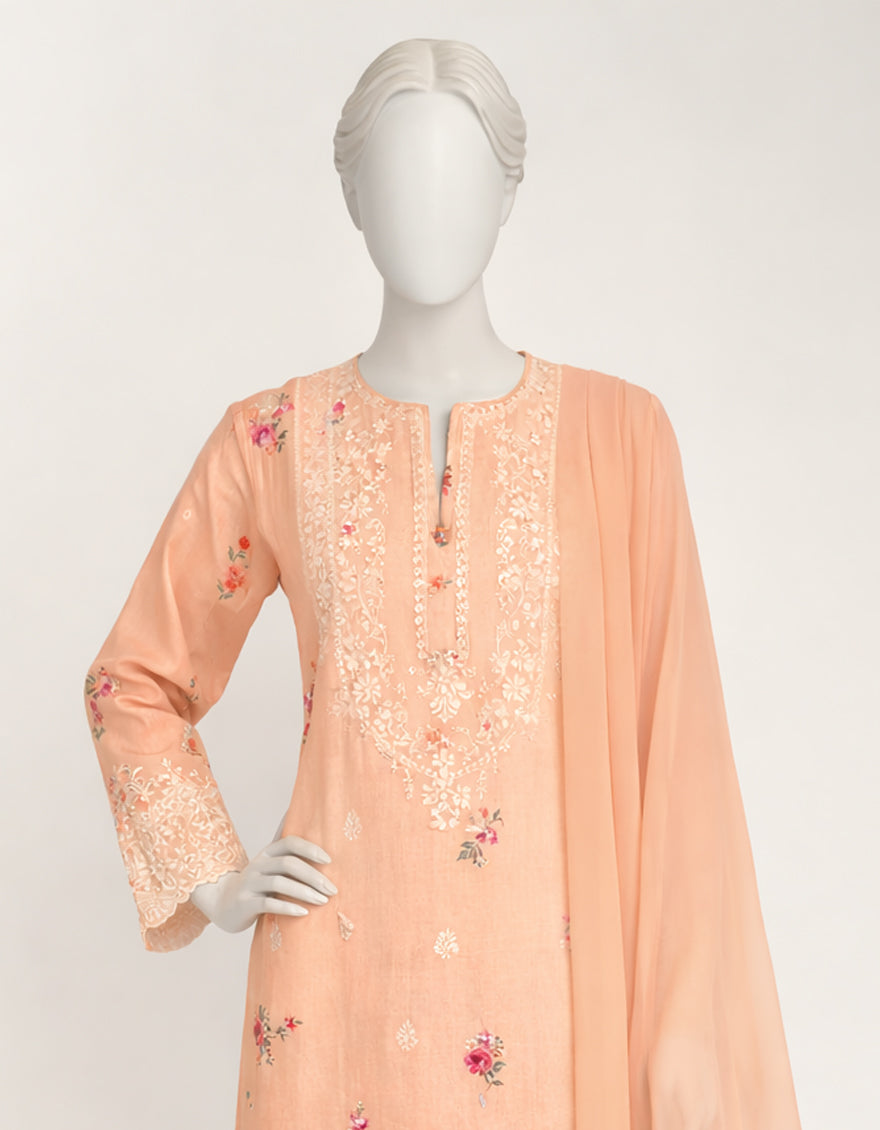 PEACH LAWN SILK 3PC STITCHED | JLAWN-S-26-574/S SCHIFFLI-A-3