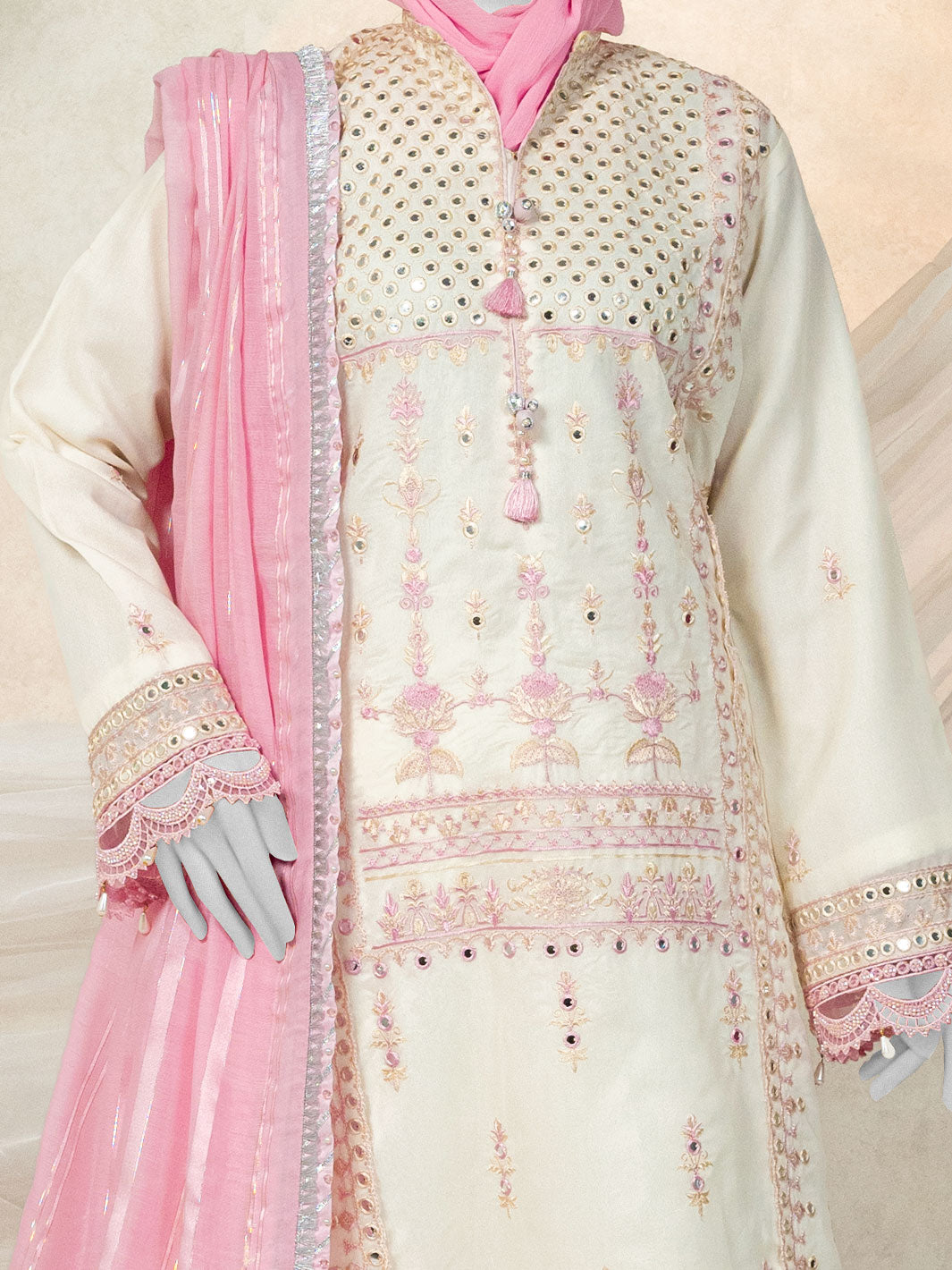 Our long embroidered shirt showcases floral geometric design, intricately woven for a timeless, artistic appeal. It is paired with straight pants, adding a graceful touch to the overall look. A dyed zari dupatta beautifully uplifts the ensemble, enhancing its charm and creating a stunning, balanced appearance.
