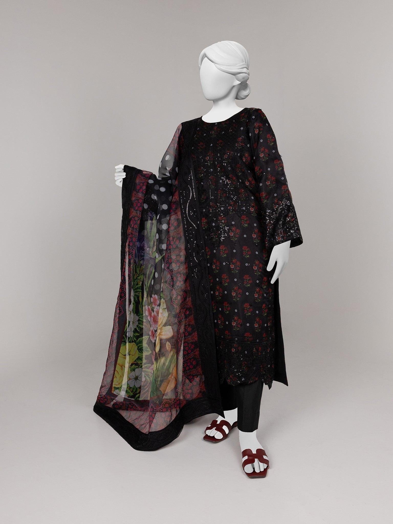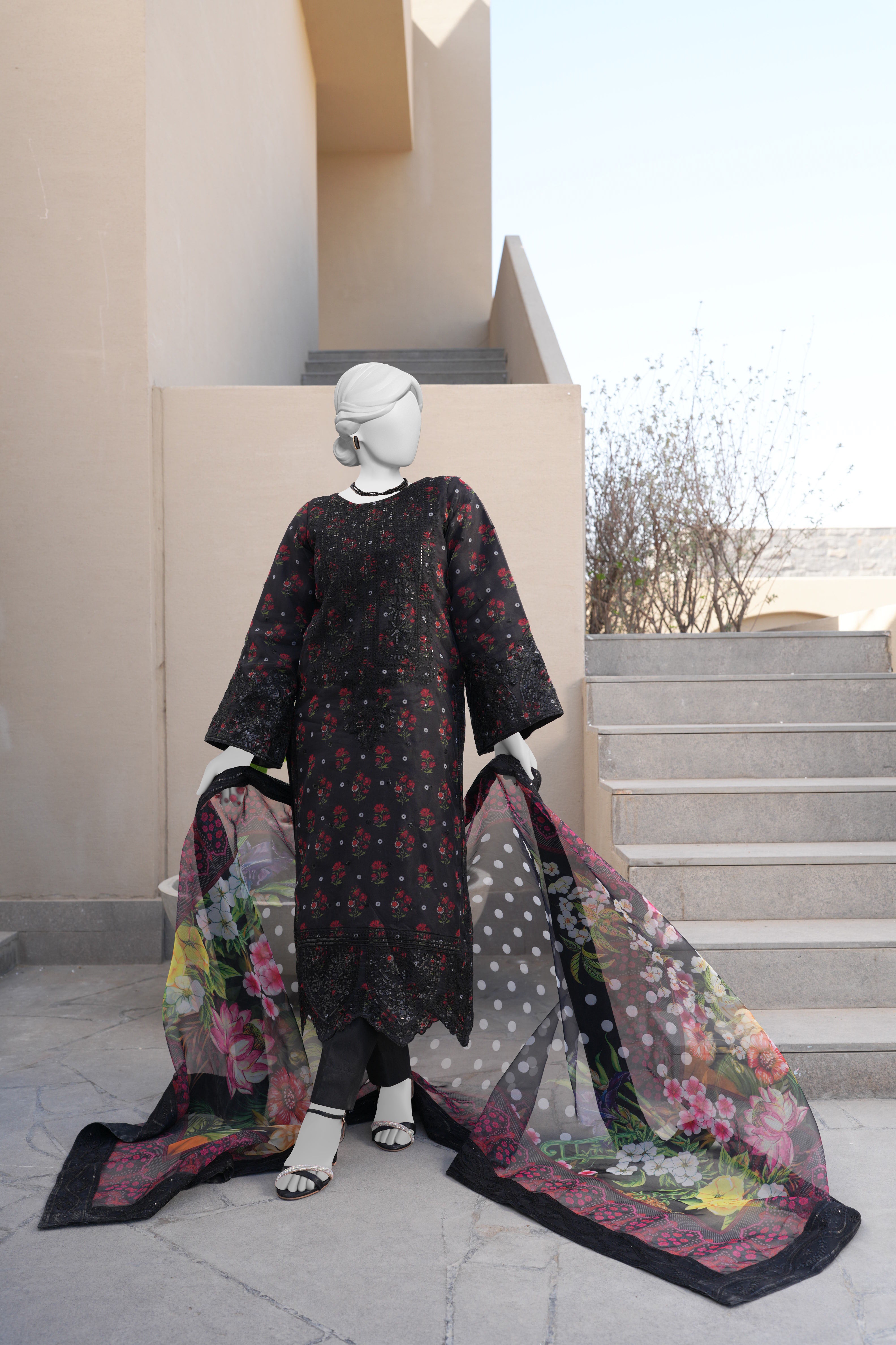 Our long embroidered black dress, printed organza shirt showcases a floral combination, intricately woven for a timeless, artistic appeal. It is paired with straight pants, adding a graceful touch to the overall look. A printed embroidered organza dupatta beautifully uplifts the ensemble, enhancing its charm and creating a stunning, balanced appearance