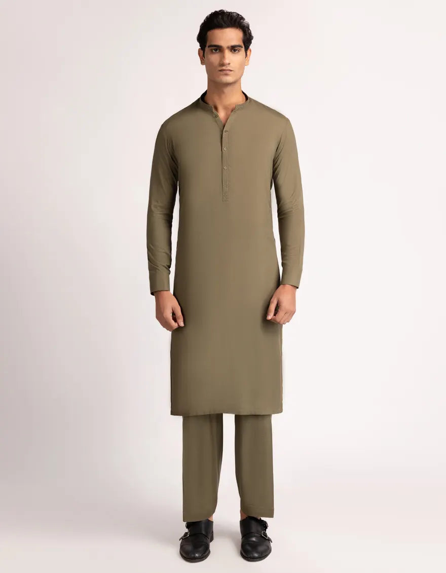 A classic eastern wear set designed with clean stitching and thoughtful detailing. The Mehndi Green Semi-Formal Kameez Shalwar offers a neat look & comfortable fit - ideal for long wear, daily use, or special occasions with a touch of tradition.
