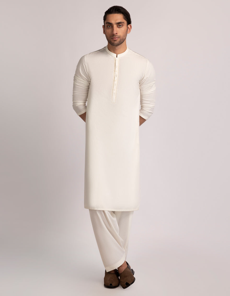 A classic eastern wear set designed with clean stitching and thoughtful detailing. The Cream Formal Kameez Shalwar offers a neat look & comfortable fit - ideal for long wear, daily use, or special occasions with a touch of tradition.