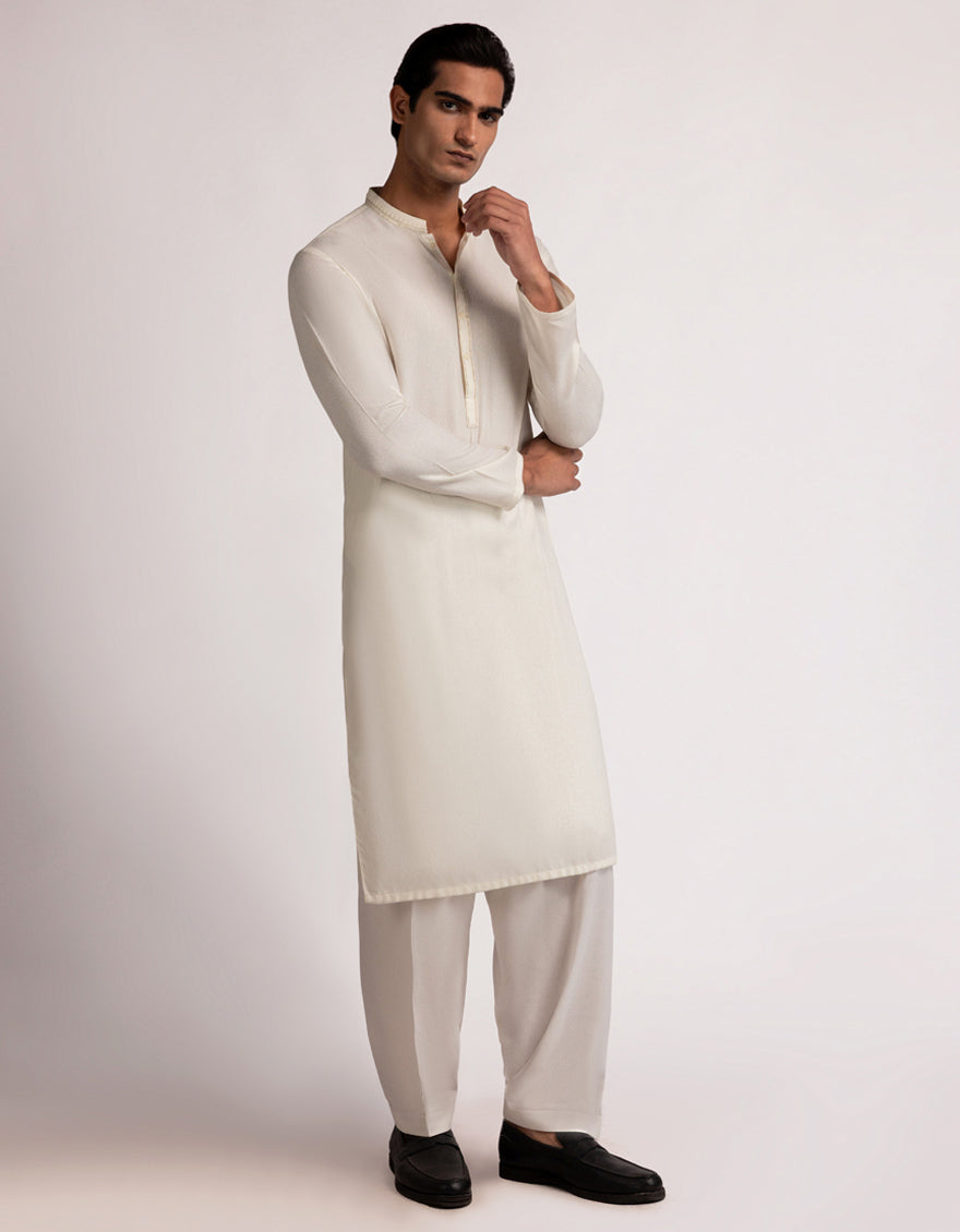 A classic eastern wear set designed with clean stitching and thoughtful detailing. The Cream Formal Kameez Shalwar offers a neat look & comfortable fit - ideal for long wear, daily use, or special occasions with a touch of tradition.