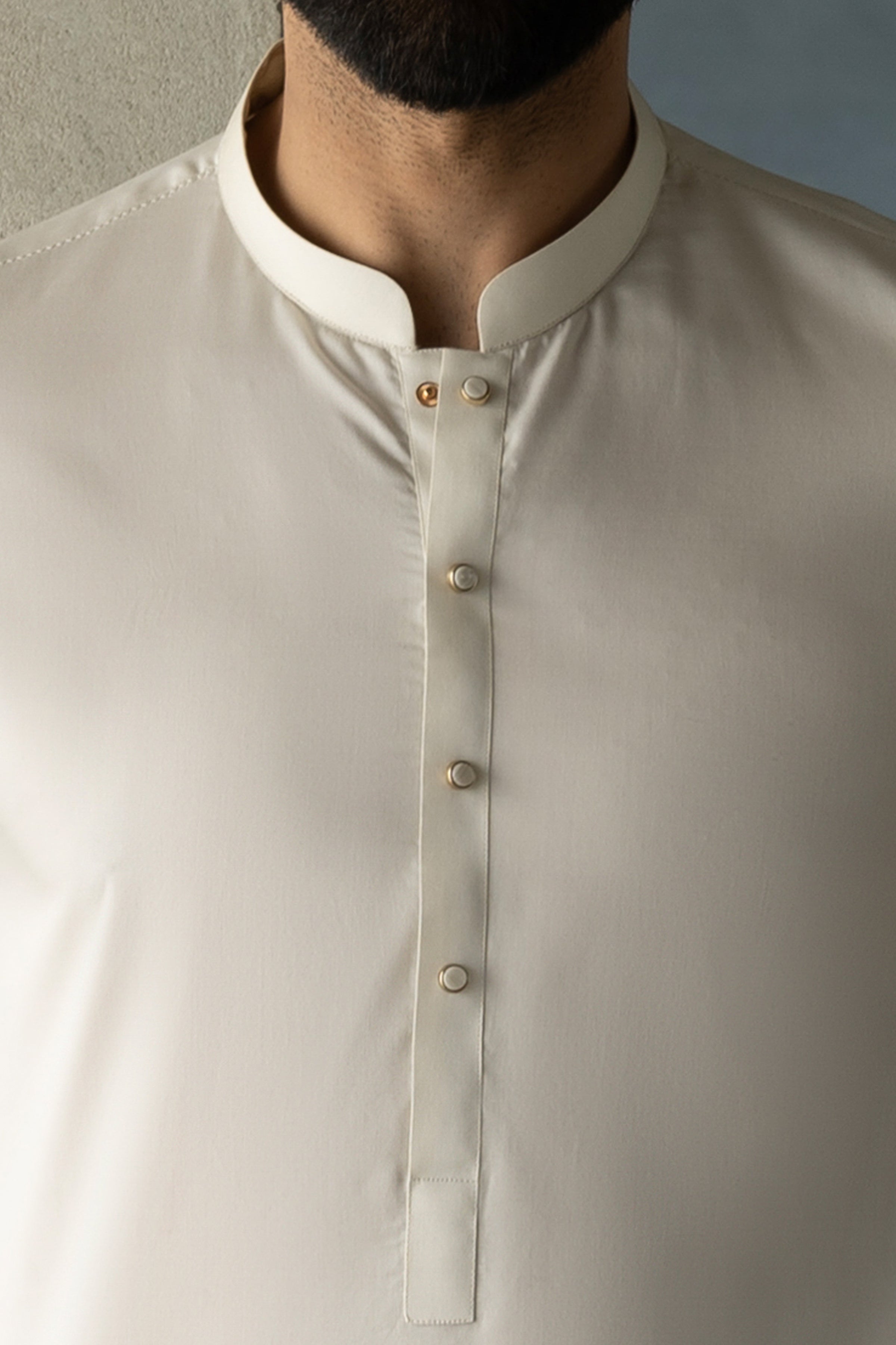 Round Edge Band Collar With Cuffs, Embroidery at Yoke, Collar Back, Front Shoulder Cuffs & Sleeve Vents, Embroidery Pattern Detail Inside Yoke and Inside Cuffs Square Hem