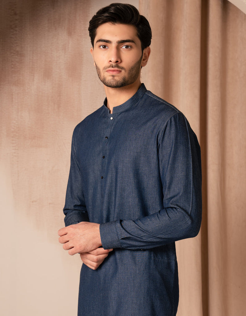 This denim blue cotton casual short kurta combines classic style with modern simplicity. Featuring a comfortable thigh-length cut, it’s designed for easy, everyday wear.
