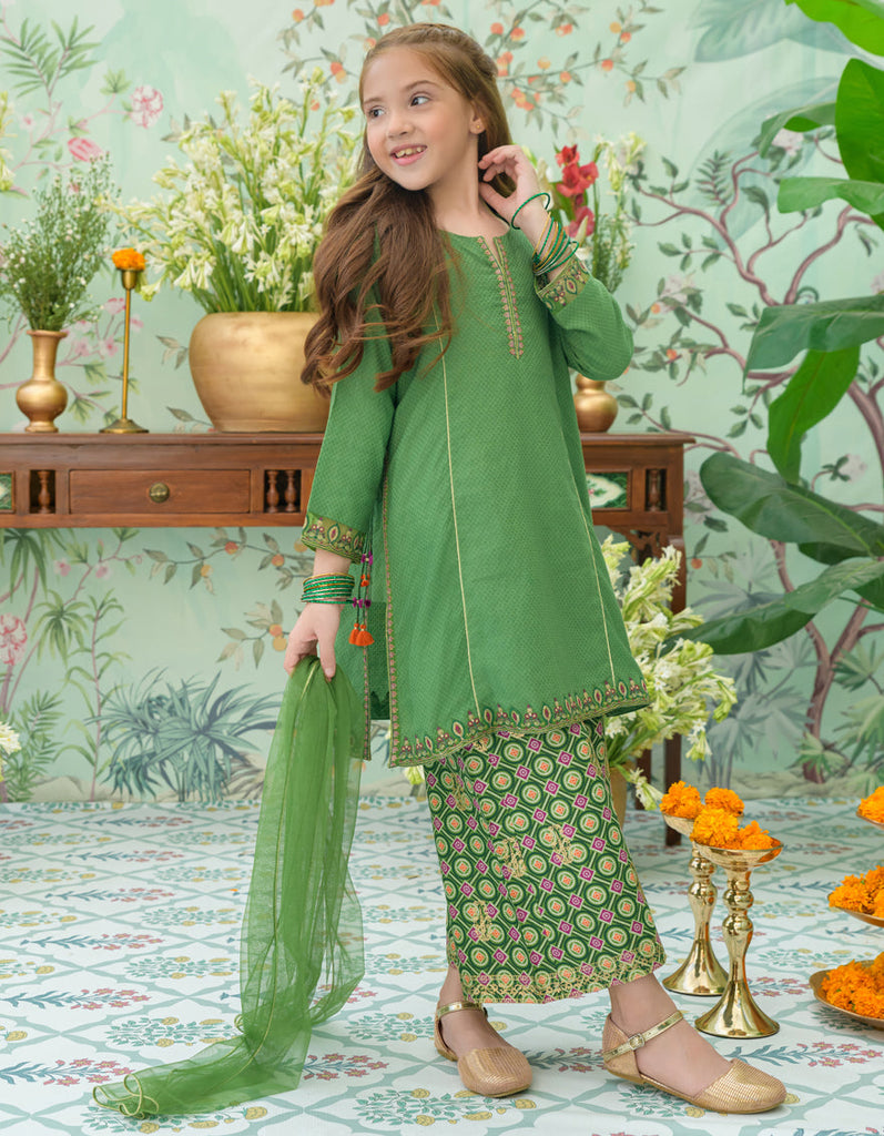 Collection: Embroidered Dobby Shirt With Foil Printed Cambric Trouser And Plain Net Dupatta