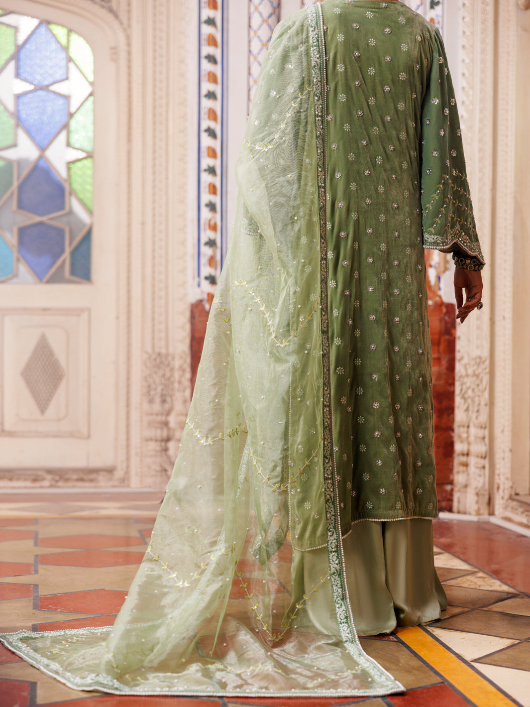 PISTACHIO GREEN VELVET 3PC STITCHED | AL-3PS-LS-497/AM-3002B