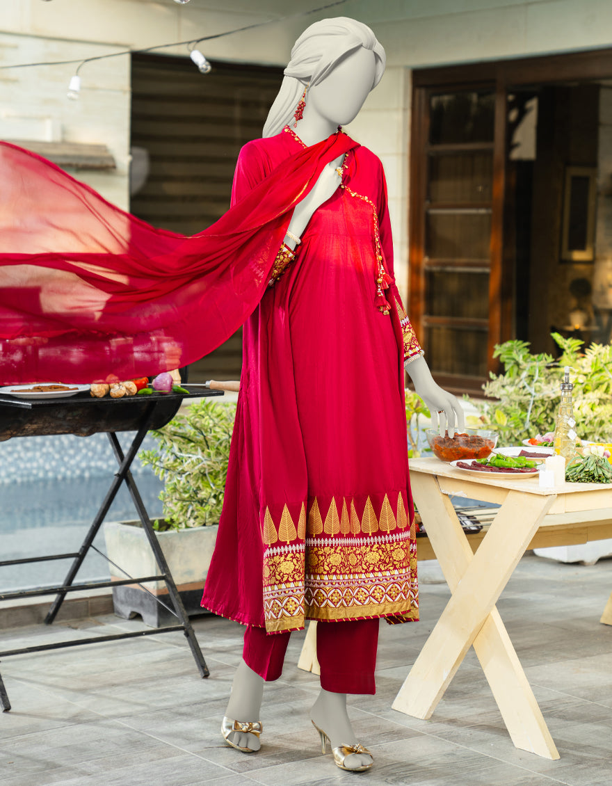 Collection: Dyed Maple Silk Shirt With Digital & Foil Border - Dyed Maple Silk Trouser - Dyed Bamber Chiffon Dupatta