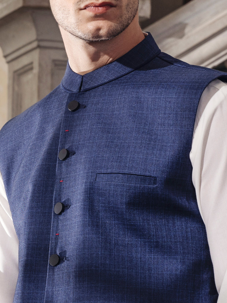 Textured Fabric Waistcoat With Black Buttons And Red Stitches
