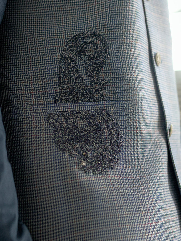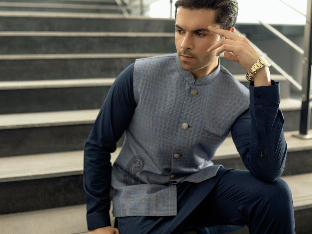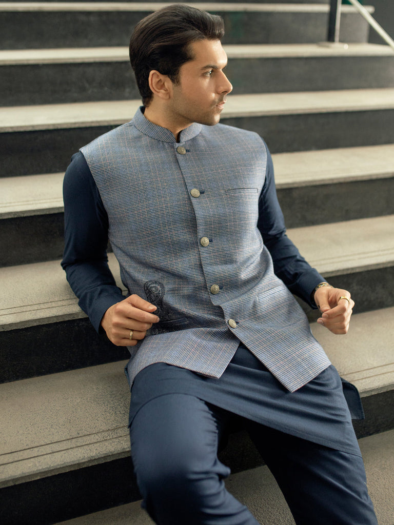 Blue Formal Waistcoat With Embroidered Motif Detail on Side of The Pocket