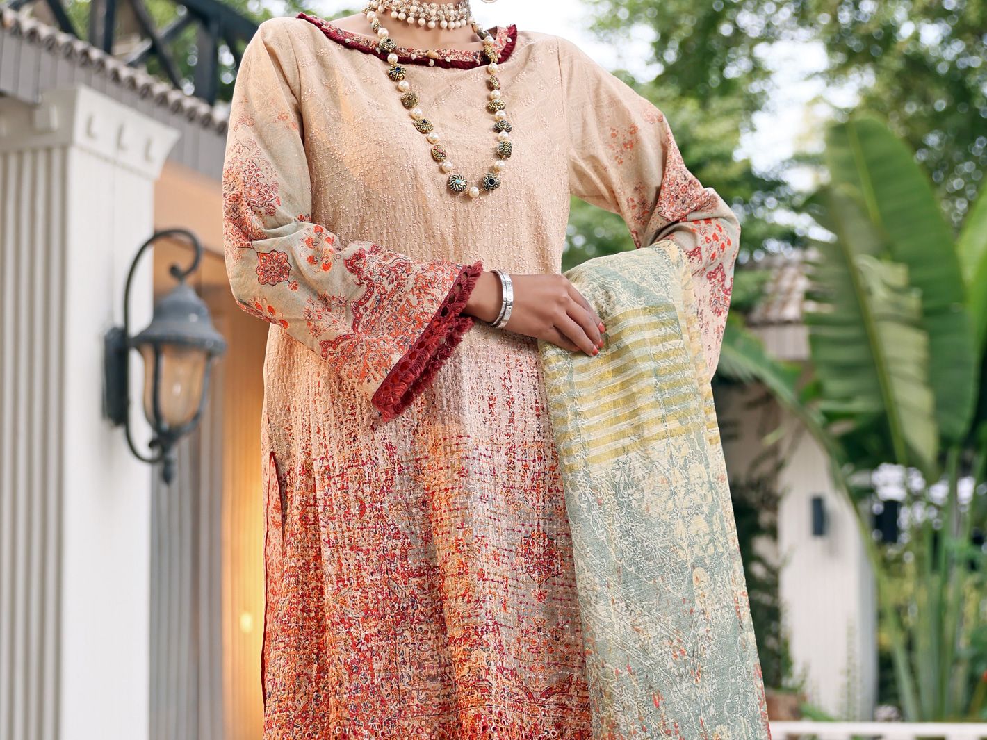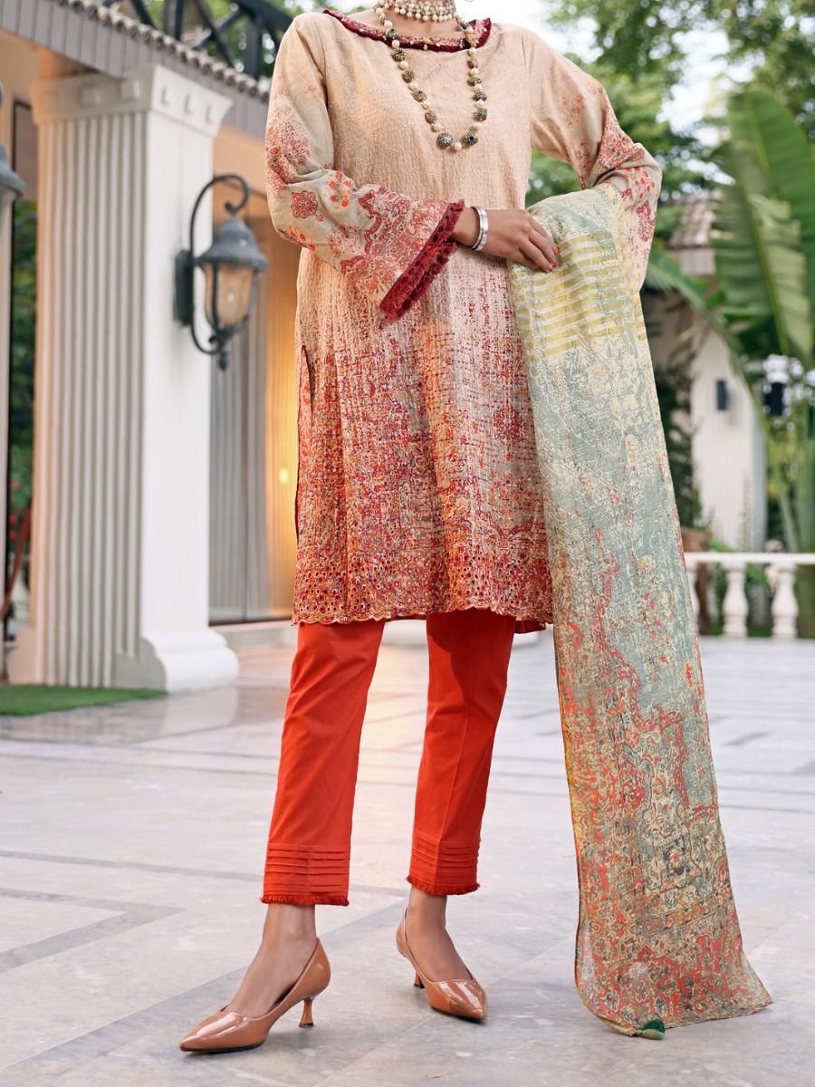 Mid Length Shirt With Schiffli Embroidered Front, Beautify With Lace Details On Sleeves And Neckline. Paired With Cotton Viscose Digital Printed Dupatta And Fitted Pants.