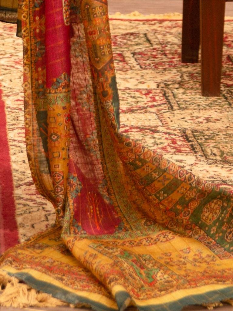 Mid Length Digital Printed Cambric Shirt With Embroidery On Front Detailed With Scallops And Organza On Sleeves. Paired With Digital Printed Viscose Net Dupatta And Bell Bottom Pants.