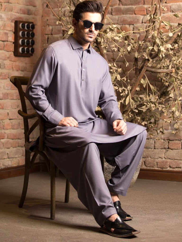 Kameez Shalwar With Shirt Collar And Minimalist Details On Placket And Cuffs.