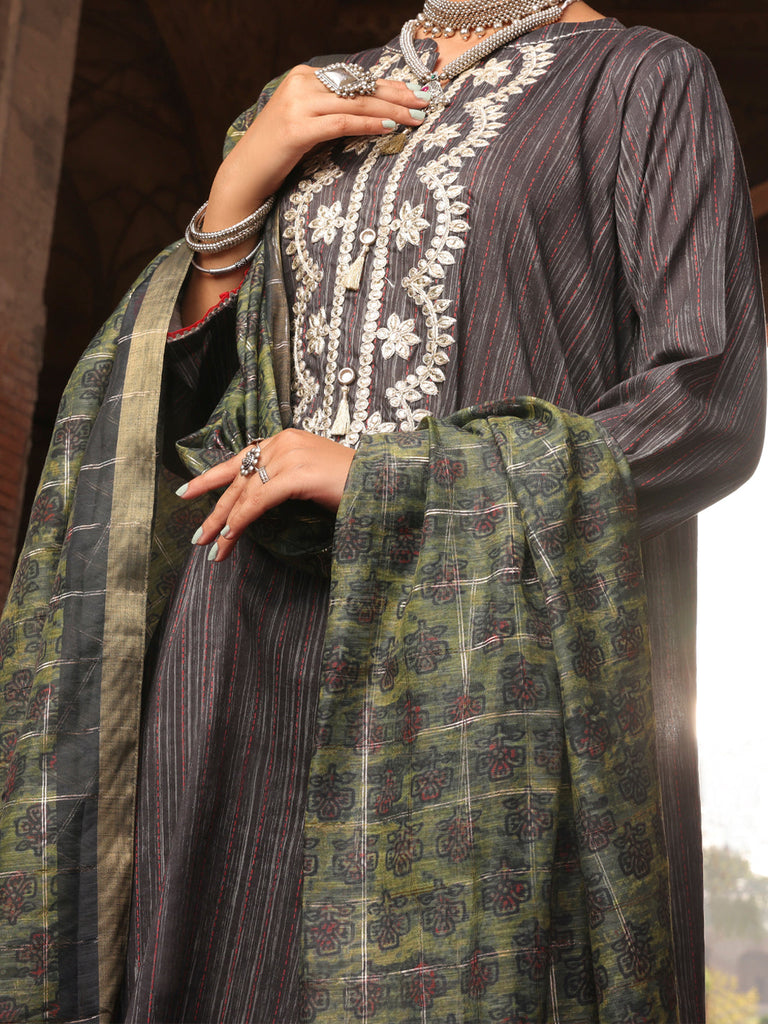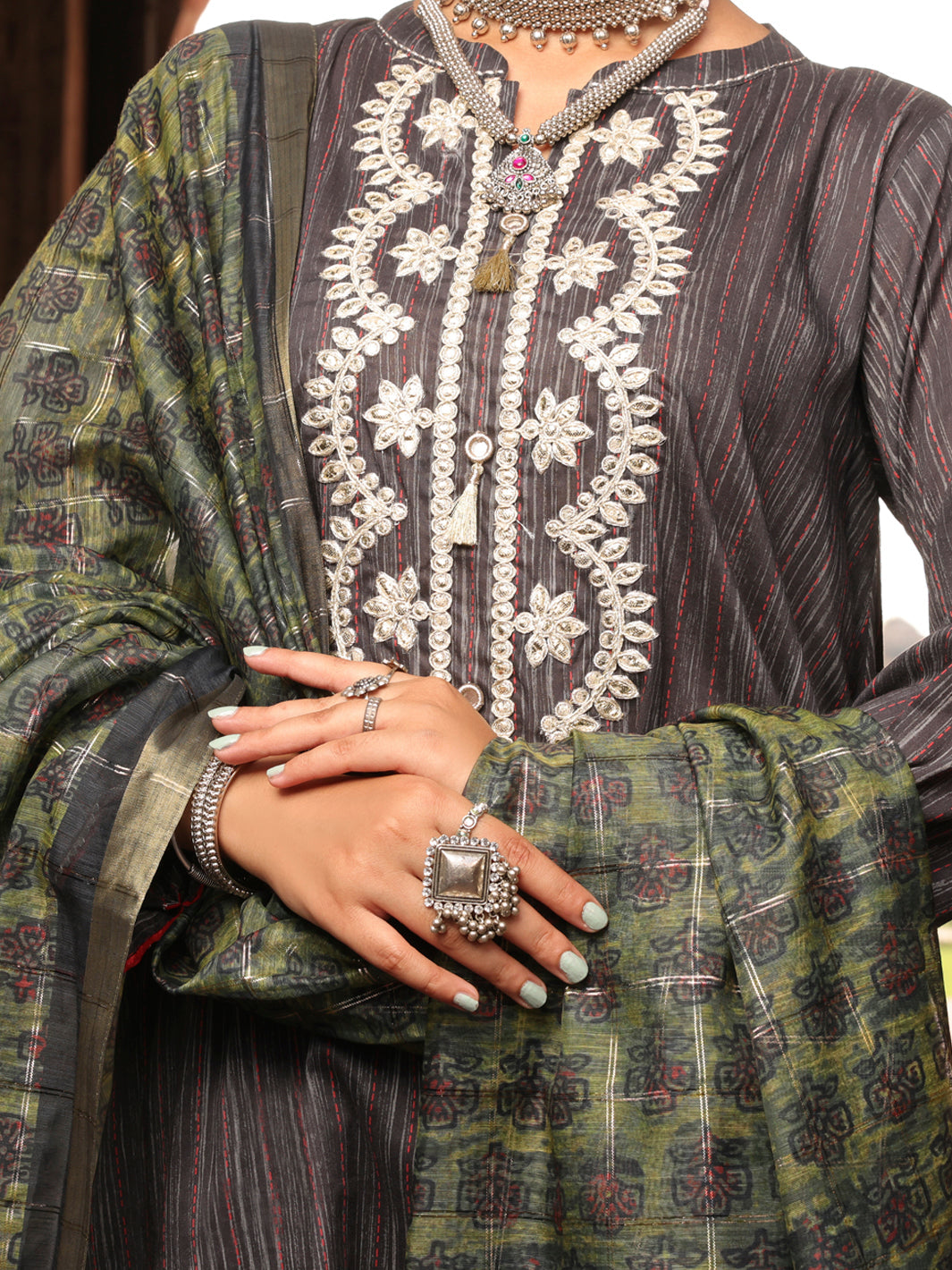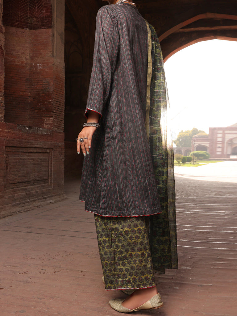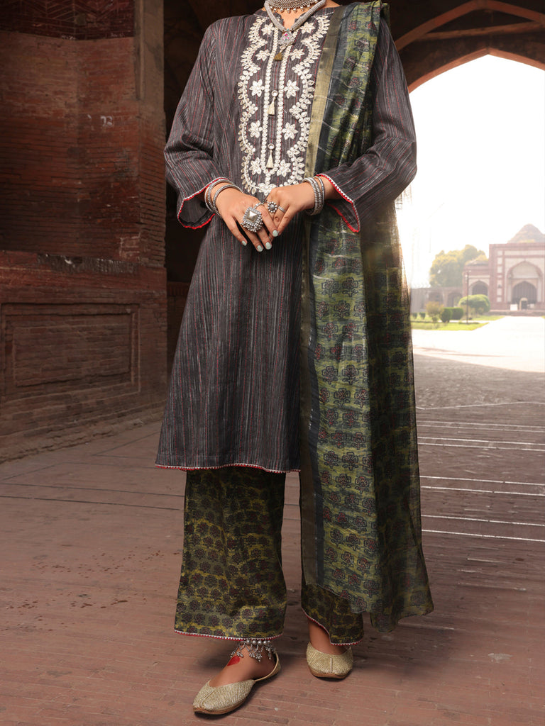 Digital Printed Cambric Shirt With Embroidered Neckline Paired With Contrasting Loose Pant and Printed Zari Dupatta.