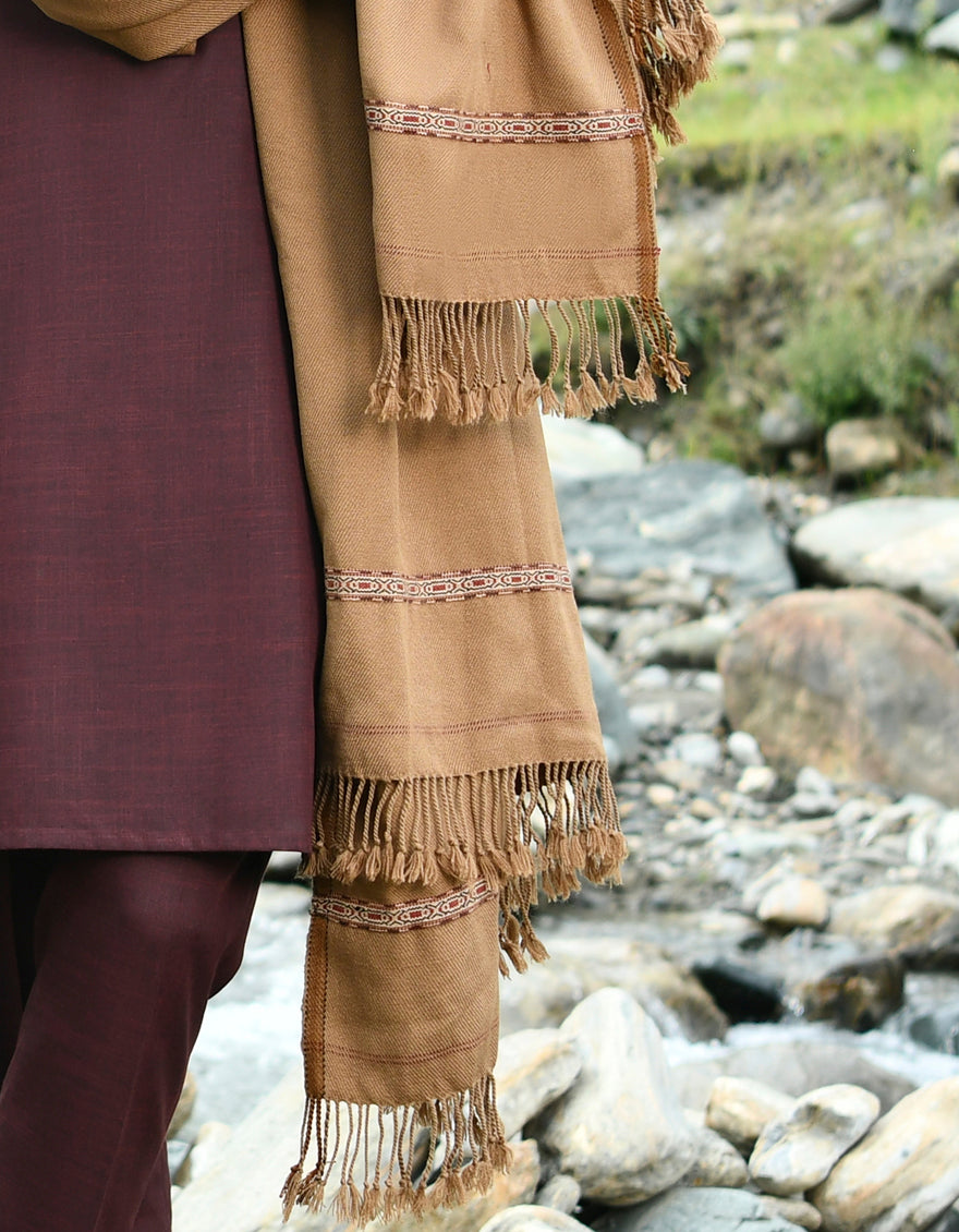 Men's Shawl With Geometric Symmetrical Weave Running on Both Edges of The Shawl And Thread Braided Tassels At The End of Each Side